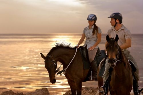 Derzeit leben auf Sir Bani Yas neun Dressur- und Westernpferde verschiedener Herkunft und Rasse. Das frühere arabische Show-Pferd Ronan, das irische Zugpferd Grady oder Annie, mit vier Jahren das jüngste Pony in der Runde, sind speziell geschult und eignen sich für Kinder und unerfahrene Reiter. Auf ihnen können Unerprobte privaten Reitunterricht nehmen oder an der Longe trainieren. Auf Profis wartet die einmalige Gelegenheit die faszinierende Inselwelt im Galopp zu erkunden. Cachorra, ein Gold Cup-erprobtes Polopferd, oder das großgewachsene irische Sportpferd Owen sind hierbei die richtige Wahl. Fans des Westernreitens finden mit dem ehemaligen Rennpferd TJ einen treuen Gefährten. Zu den Highlights der angebotenen Reitausflüge zählt der zweistündige Royal Bay Ride, bei dem fortgeschrittene Reiter den Strand der Insel sowie die Tierwelt erkunden. Für Romantiker ist der ebenfalls zweistündige Sunset Ride im Arabian Wildlife Park empfehlenswert, denn nirgendwo auf der Insel kann man so ungestört den Sonnenuntergang bewundern.