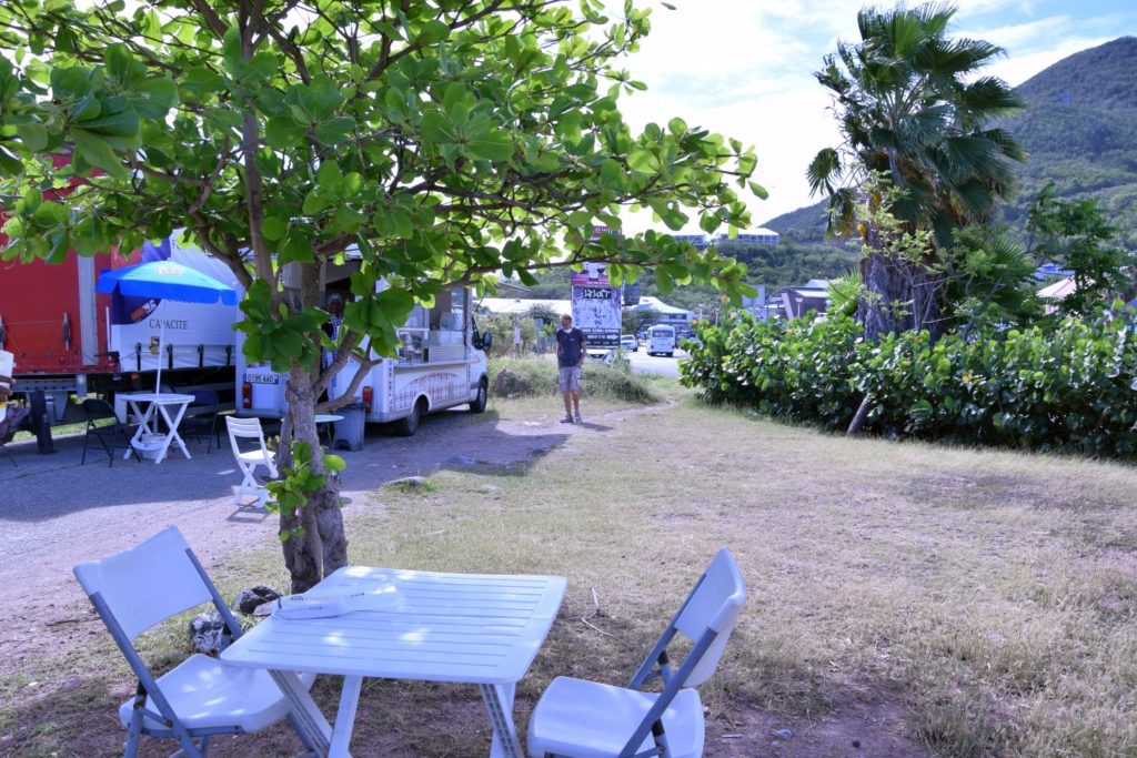 Ihr Foodtruck steht gegenüber des Grand Case Airport und es gibt sogar ein paar schattige Sitzplätze davor.