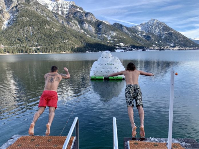 Der Tauchclub „Black Divers Tirol“ hatte eingeladen und allen war klar, wie die Vorgaben lauteten für diesen einmaligen Jahresausklang: Vier Grad Celsius Wassertemperatur, drei Meter Sprunghöhe und 50 Meter Schwimmdistanz. Paarweise traten die Schwimmerinnen und Schwimmer in der Kategorie SPORT den Kampf gegen den inneren Schweinehund, gegen die Konkurrenz und gegen den winterlichen Achensee an. Nach einem Sprung vom Steg galt es eine Distanz von 25 Metern bis zu einem schwimmenden Eisberg zurückzulegen, diesen zu erklimmen, die Silvesterglocke zu läuten und schlussendlich wieder an das Ufer zurückzuschwimmen. Zielsetzung war allerdings nicht, die schnellste Zeit hinzulegen – galt es doch, der Mittelzeit aller Teilnehmer am nächsten zu kommen.