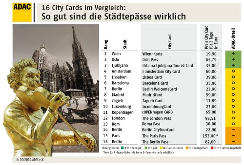 Sie sind beliebt bei Städtetouristen und sparen im besten Fall viel Geld: City Cards werben mit Rabatten auf Eintritte in Museen, Veranstaltungen, sportliche Aktivitäten, Restaurants und andere Attraktionen. Ob diese Karten tatsächlich halten, was sie versprechen, hat der ADAC jetzt getestet. Verglichen wurden Angebote in 16 europäischen Städten: Amsterdam, Barcelona, Berlin, Kopenhagen, Lissabon, Ljubljana, London, Luxemburg, Madrid, Oslo, Paris, Rom, Wien und Zagreb.