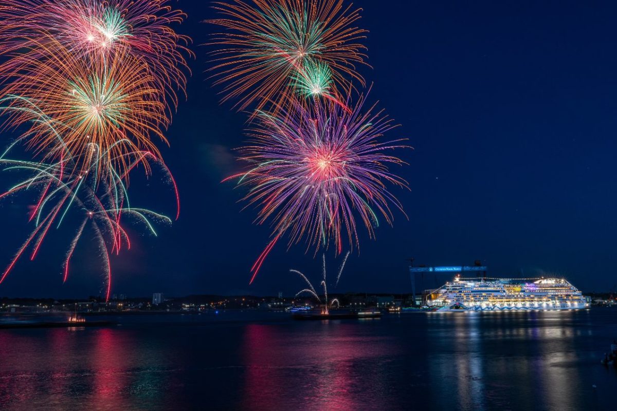 Das fulminante Lichtspektakel erleuchtete den Nachthimmel über der Innenförde und verwandelte die Kulisse in ein funkelndes Farbenmeer. Zeitgleich zum Feuerwerk verabschiedete sich AIDAbella aus Kiel und nahm Kurs auf Lerwick (Großbritannien). Auf der 14-tägigen Reise ab Kiel macht das Schiff außerdem Station in Island, Schottland und Dänemark.