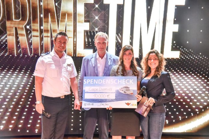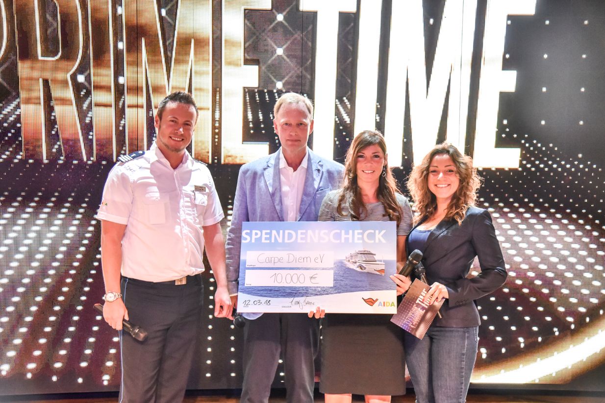 AIDA überreichte während drei Reisen mit AIDAprima im Zeitraum vom 10. bis 31. März 2018 Spendenschecks in Höhe von jeweils 10.000 Euro an drei Heldinnen des Alltags. Bettina Landgrafe, Anja Gehlken und Sylke Hoß wurden im vergangenen Jahr bei einer Gala auf AIDAprima von Europas größter Frauenzeitschrift für ihr ehrenamtliches Engagement und Zivilcourage ausgezeichnet.
