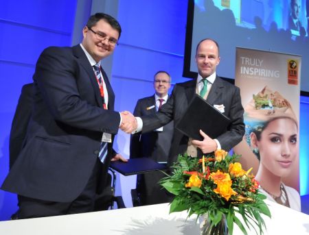 Nazim Samadov, Deputy Minister für Kultur und Tourismus Aserbaidschan, und Dr. Christian Göke, COO Messe Berlin, unterzeichneten die ITB Berlin Kongresspartnerschaft mit Aserbaidschan für das Jahr 2013, Foto: ITB