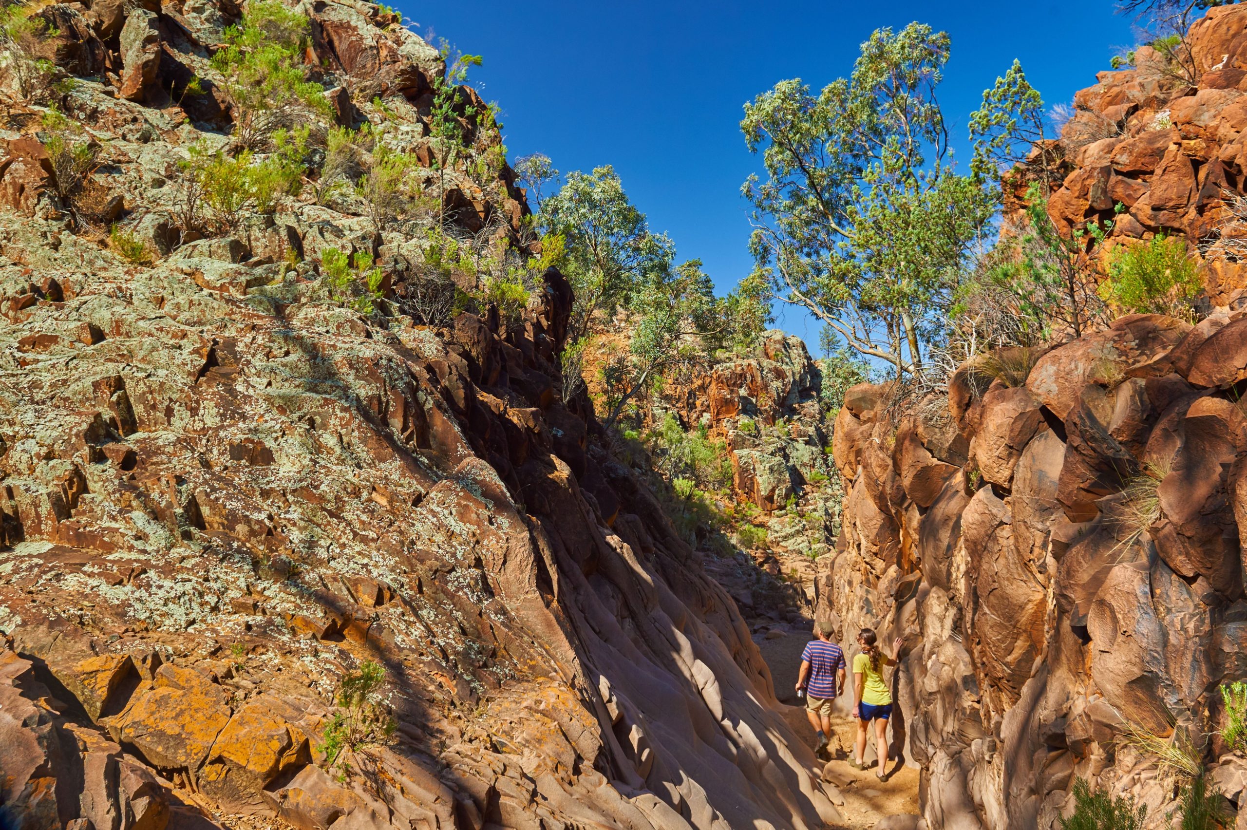 Gesteinsformationen, verbirgt sich ein Ort von besonderer Bedeutung: der Arkaroo Rock. Über einen etwa drei Kilometer langen Wanderweg erreichbar, offenbart er uralte Felsmalereien und Gravuren, kunstvoll geschaffen mit Ocker- und Kohlefarben. Diese jahrtausendealten Bilder erzählen die Schöpfungsgeschichte von Wilpena Pound – jenem imposanten Bergmassiv, das für das Volk der Adnyamathanha ein heiliger Ort ist und zeugen von der tiefen Verbindung der Aboriginal People zur Natur. Auch die mächtigen Sandsteinwände des Sacred Canyon, der „heiligen Schlucht“, sind mit uralten Gravuren verziert. Tief in den Fels geritzt, erzählen sie von vergangenen Zeiten und zeigen Tierspuren, menschliche Figuren, Wasserstellen sowie geheimnisvolle Symbole.