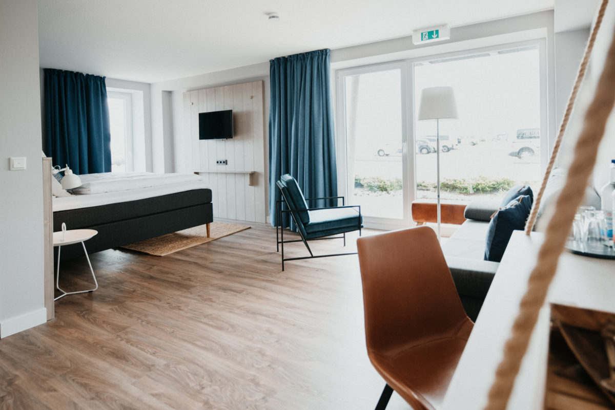 Das neue Hotel Siel59 besteht aus insgesamt elf Einzel- und Doppelzimmern mit bis zu 20 Quadratmetern und folgt dem Gestaltungsansatz „Schlafen unter Deck“, da die Zimmer unterhalb des Festsaales und des Restaurants direkt am Deich liegen. Sie erinnern im weitesten Sinne an „Matrosenbuden“, denn hier gibt es Spinde statt Kleiderschränke, eine Holzverbretterung als Betthaupt, Taue, an denen die Schreibtischplatten angehängt sind und eine Wellentapete, die das Meeresrauschen in die Zimmer holt. Hochwertige Boxspringbetten sorgen für den erholsamen Schlaf. Jedes Detail zählt hier, so wie die Zimmerschlüsselanhänger aus Treibholz.