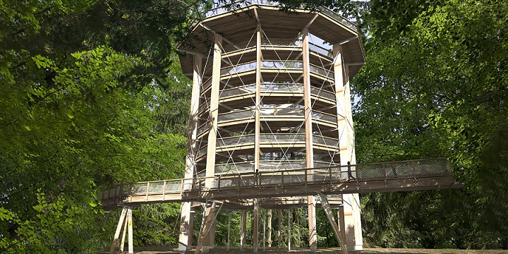Vosges du Nord und dem Centre d“Initiation à la Nature et à l“Environnement (CINE) erarbeitet. Darüber hinaus laden Erlebnisstationen in luftiger Höhe mit zahlreichen Balancierelementen zum Mitmachen ein. Aufgrund einer Steigung von maximal sechs Prozent ist der Pfad auch für Rollstuhlfahrer sowie Besucher mit Kinderwagen problemlos zu erkunden. Genau wie alle anderen Baumwipfelpfade der eak erhält auch die neue Naturerlebniseinrichtung in Drachenbronn-Birlenbach einen Aussichtsturm. Nach seiner Fertigstellung bietet der circa 29 Meter hohe Turm, als einer der höchsten Punkte entlang der Ausläufer der Vogesen, eine einmalige, 360 Grad umfassende Aussicht über die Rheinebene, den Schwarzwald und die Nordvogesen. Und als besonderes Highlight verläuft von der obersten Aussichtsplattform eine Tunnelrutsche im Turminneren nach unten. Über ein Multifunktionsgebäude mit Ein- und Ausgang gelangen Besucher auf den Baumwipfelpfad. Ein integrierter Merchandiseshop, eine Gastronomie mit Wintergarten und Terrassenbereich sowie ein kostenloser Shuttle-Zug, der vom großen Parkplatz bis zum Eingangsbereich des Baumwipfelpfads führt, werden zusätzlich zum Baumwipfelpfad realisiert. Zudem ist als Erweiterung des Angebots ab Herbst 2020 der Bau eines Abenteuerspielplatzes auf dem Gelände vorgesehen.