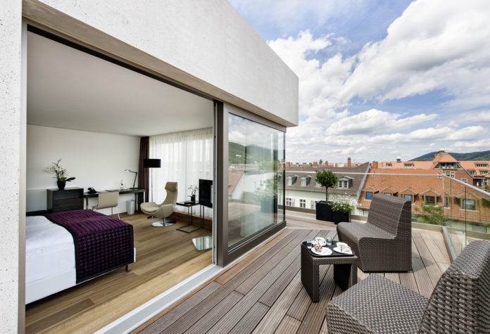Auf dem Gelände des 1903 erbauten Jugendstilhauses, das seit dreißig Jahren aus Sicherheitsgründen nicht mehr als Bad genutzt werden konnte, entstanden in niedrigenergetischer Bauweise insgesamt 32 moderne Gästezimmer, darunter auch sechs Studios, davon eines mit In-Room-Sauna. Eine designorientierte und wohnliche Ausstattung mit Holzdielen und bodentiefen Glasfassaden prägen die Zimmer. Helle Töne, kombiniert mit geschmackvoll korrespondierenden farblichen Akzenten, bestimmen das Ambiente. Ausschließlich Tageslichtbäder sorgen für ein angenehmes Dusch- und Badeerlebnis. Ein Highlight im wahrsten Sinne des Wortes stellt der 45 Quadratmeter große begrünte Dachgarten mit Blick auf das Heidelberger Schloss dar. Alle Zimmer in der fünften Etage sind darüber hinaus mit einer eigenen Terrasse über den Dächern der Stadt ausgestattet.
