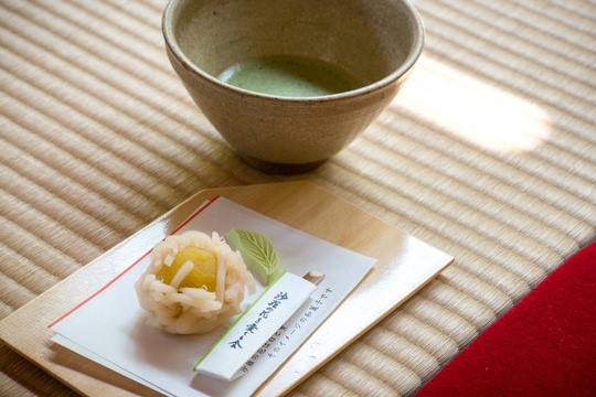 Zu einem klassischen Matcha-Tee reicht man übrigens ein kleines Konfekt, ein sogenanntes Wagashi. Diese sehr süße Beigabe wird vor dem Tee gegessen und soll eine Balance im Zusammenspiel mit dem eher bitter schmeckenden Matchatee schaffen.
