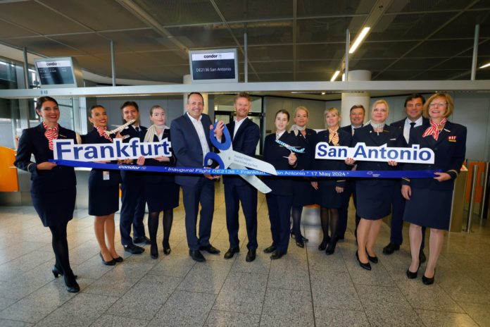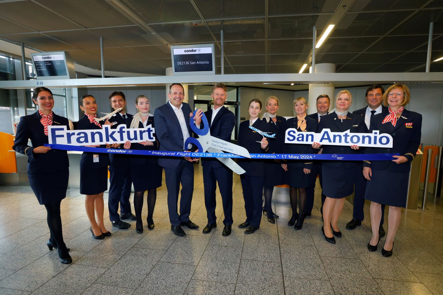 Auf nach Texas: Am heutigen Freitag um 14:43 Uhr startete die Condor A330neo mit der Kennung D-ANRO ab Frankfurt nach San Antonio in Texas. Am Frankfurter Flughafen wurde der Flug von Peter Gerber, CEO Condor sowie Pierre Dominique Prümm, Vorstand Aviation und Infrastruktur Fraport AG mit einem Ribbon Cut verabschiedet. Mit den Flügen baut Condor das Nordamerikaprogramm weiter aus und bietet ab sofort die einzige Direktverbindung ab Europa nach San Antonio an. Im Rahmen des Sommerflugplans können Gäste mit drei wöchentlichen Verbindungen – montags, mittwochs und freitags – in die texanische Metropole fliegen.