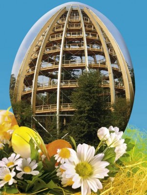 Osterei gibt Rätsel auf: 44 Meter hoch ist das Baum-Ei am Ende des Baumwipfelpfads in Neuschönau im Nationalpark Bayerischer Wald. Am Ostersonntag und –Montag hält der Osterhase für die kleinen Besucher Überraschungen bereit. Entlang des Baumwipfelpfades hat er überdies Ostereier versteckt. Wieviele, das können Kinder und Erwachsene bei der Ostereiersuche herausfinden oder einfach raten. Wer die richtige Anzahl weiß, gewinnt tolle Preise.