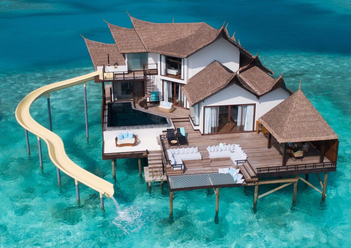Die freistehenden Private Ocean Retreats und sieben der Infinity Pool Ocean Villas des Resorts verfügen nun jeweils über eine 23 Meter lange Rutsche, die vom oberen Deck in das kristallklare Wasser der Lagune führt.