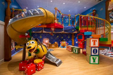 Direkt nebenan befindet sich Andy’s Room, wo die Stars aus der Disney•Pixar-Trilogie Toy Story zum Leben erweckt werden: Hier gibt es etwa einen überlebensgroßen Charlie Naseweis, eine riesige Version des süßen Sparschweins Specky und die Rutsche Slinky.