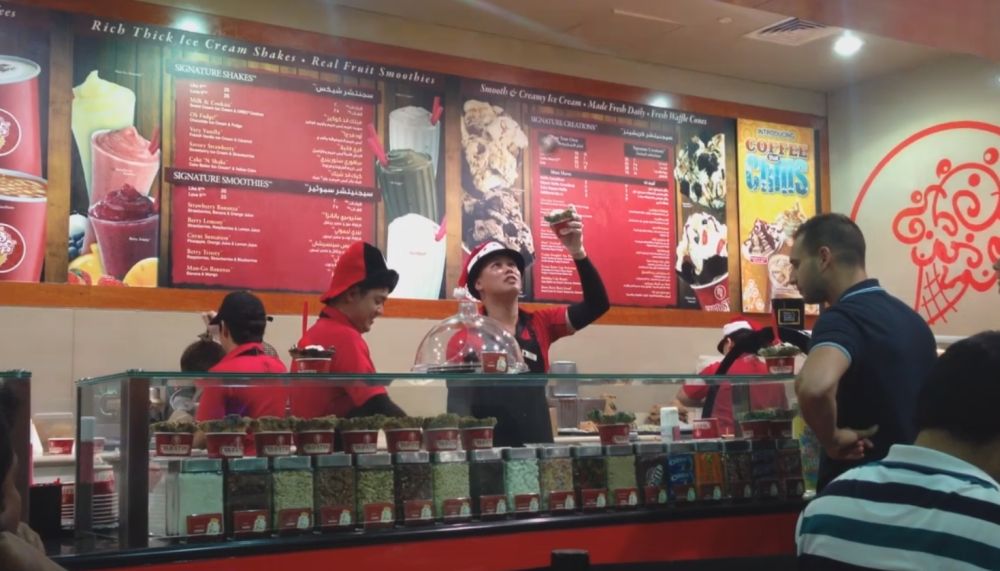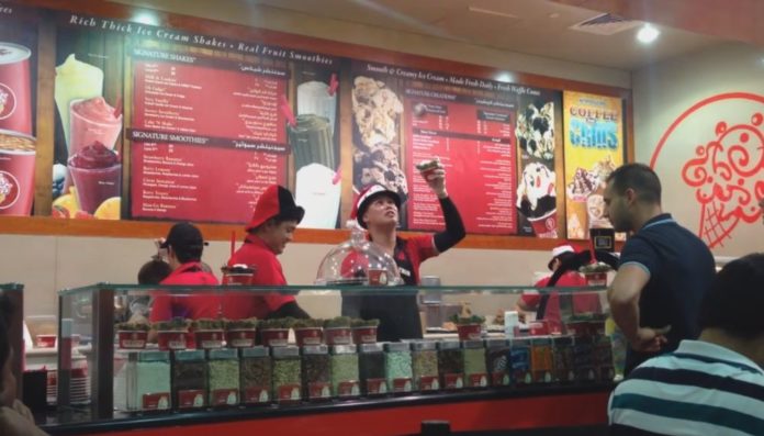 Dubai ist mehr und mehr auch gerade im Bereich Familienurlaub angesagt. Nicht mehr nur die Superlativen zählen und vor allem die kulturellen Aspekte haben sich positiv entwickelt. Das weiß auch dieser Eisverkäufer und unterhält seine Eiskundschaft hervorragend mit akrobatischen Einsätzen während des Eisverkaufens. Das ist das neue Dubai: Aufgeschlossen – modern und unterhaltsam und irgendwie trotzdem noch Orient.