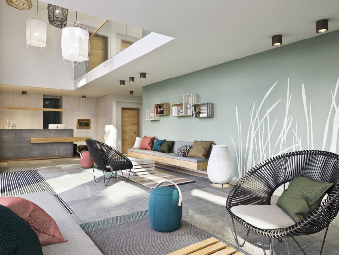 Im Kontrast dazu entsteht ein energieeffizientes neues Bauwerk mit klaren Linien und einem Mix aus modernem Design, Upcycling und Fotokunst rund um das Thema Beach. Er erzeugt ein interessantes Spannungsfeld zwischen Historie und Zeitgeist. Neben 30 Zimmern, alle mit Balkon oder Terrasse und Meerblick, ist auf dem Dach ein neuer Wellnessbereich mit direktem Ostseeblick untergebracht. Das Motto ist Programm: Sand, Strand, Meer. Neben Sauna und Ruheraum stehen hier heimische Wellnessrituale mit Rapsöl, Algenprodukten oder Sandpeeling auf dem Spa-Menu. Die Verbindung zwischen den beiden Häusern schafft der mit Dünengras angelegte Außenbereich, der als Strandlounge die Gäste begeistern wird. Die Fassade des Neubaus wird an das historische Haupthaus angepasst und mit einem hellen, gelben Ziegelstein in moderner Optik aufgemauert. Zudem wird das Areal umweltschonend mit einem eigenen Blockheizkraftwerk beheizt, das zusätzlich auch einen Teil des Strombedarfs decken soll.
