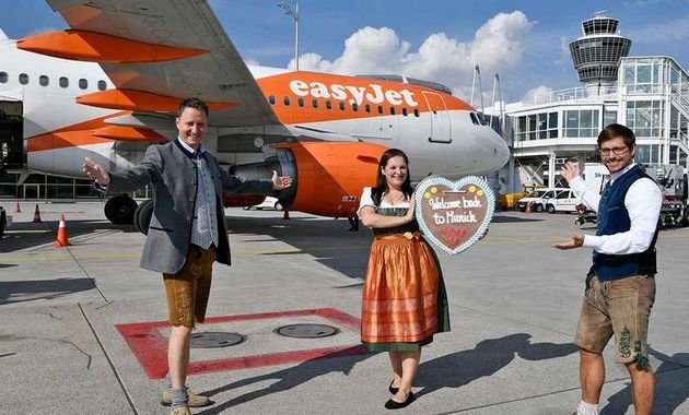 Ein weiteres Flugziel ist von München aus ab sofort wieder erreichbar: Die britische Fluggesellschaft easyJet startet jeweils montags, mittwochs, freitags und sonntags nach London Gatwick. Unser Bild zeigt die Airlinebetreuer der Flughafen München GmbH (FMG) Oliver Dersch (links) und Stephan Weisang sowie Julia Eichhorn vom Aviation Marketing der FMG mit einem Willkommensgruß anlässlich der Wiederaufnahme der Flüge.