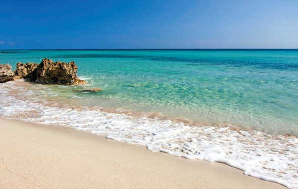 1. Cala Saona: Ein malerischer, von Klippen geschützter Strand, an dem das türkisblaue Wasser und die unberührte Umgebung es ermöglichen, in eine Oase der Ruhe einzutauchen. Die Westküste der Insel besteht hauptsächlich aus höheren Felsen, zwischen denen sich Cala Saona befindet – eine kleine, natürliche und wunderschöne Bucht. Dank ihres flachen Wassers ist sie besonders bei Familienurlaubern beliebt. Dieser Strand wird von kleinen Klippen mit traditionellen Trockendock-Häusern eingerahmt, in denen kleine Fischerboote liegen.