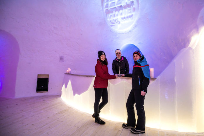 Bevor es sich auf den Rentierfellen bequem gemacht wird, kann noch ein Drink an der Eisbar genossen werden – natürlich eiskalt serviert.