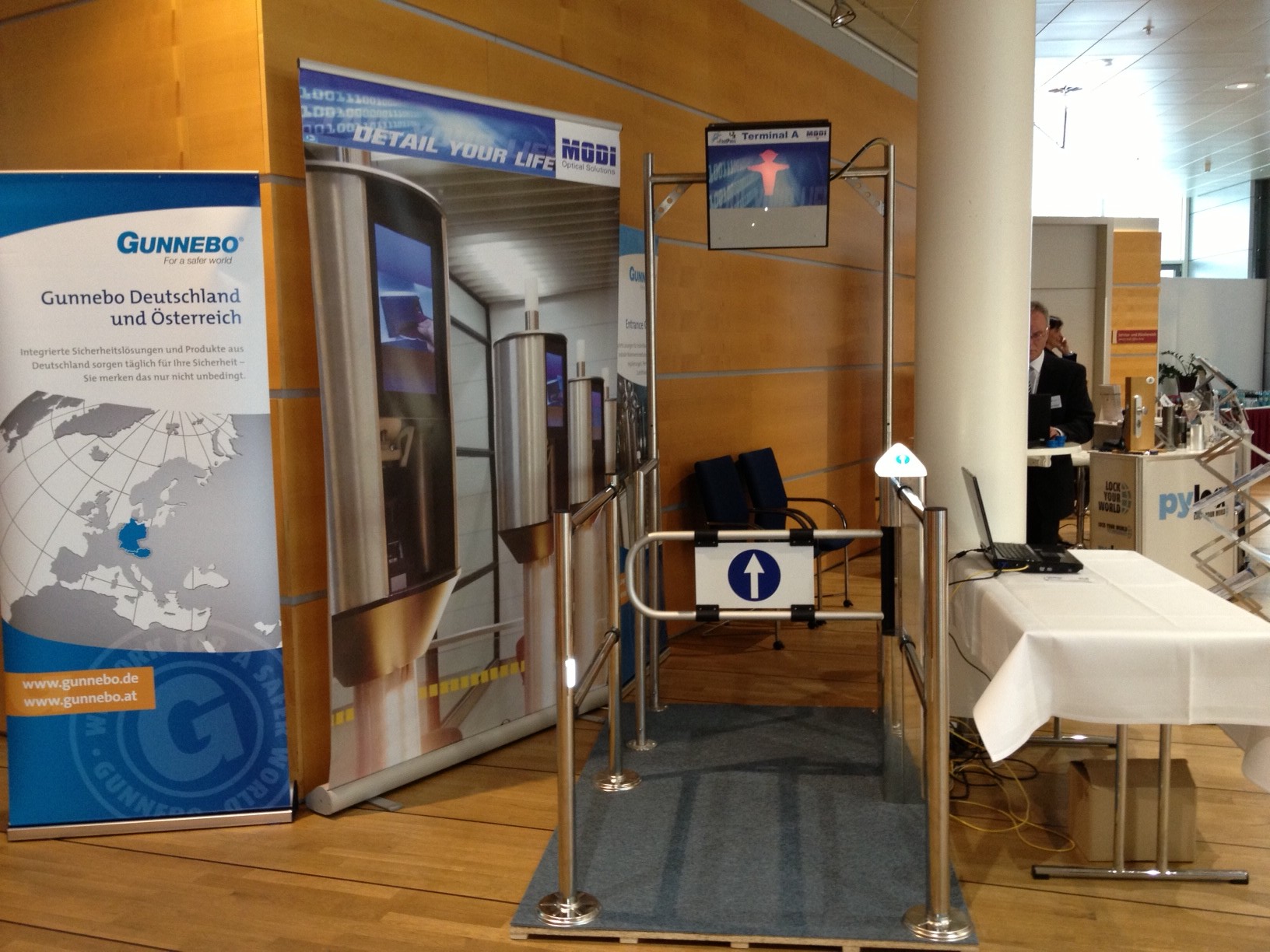 Zusammen mit der Firma Gunnebo zeigte man in Potsdam eine Personen – Schleuse, in der beim Durchlauf die Personen anhand von Gesichtsmerkmalen innerhalb weniger Millisekunden erkannt und für den Durchgang freigegeben werden. Die vollständige Einheit ist im Design eines Flachbildschirms aufgebaut und enthält die komplette Kameratechnik, Informationsmonitor und Lichttechnik. Durch die eingesetzte Adomo® Technologie ist das System in der Lage die unterschiedlichen Personengrößen unabhängig von der Position blitzschnell auszugleichen und ermöglicht so die Personenidentifikation selbst im schnellen Durchlauf.