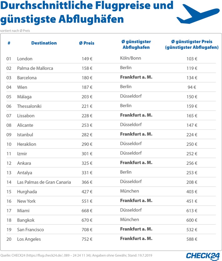 Vom Flughafen Frankfurt am Main reisen Urlauber am günstigsten ins Ausland. Sieben der 20 beliebtesten Flugziele der CHECK24-Kunden außerhalb Deutschlands sind am günstigsten von Frankfurt aus erreichbar. Dazu gehören neben den drei amerikanischen Metropolen New York, San Francisco und Los Angeles auch die beiden türkischen Städte Istanbul und Ankara sowie Barcelona und Lissabon.