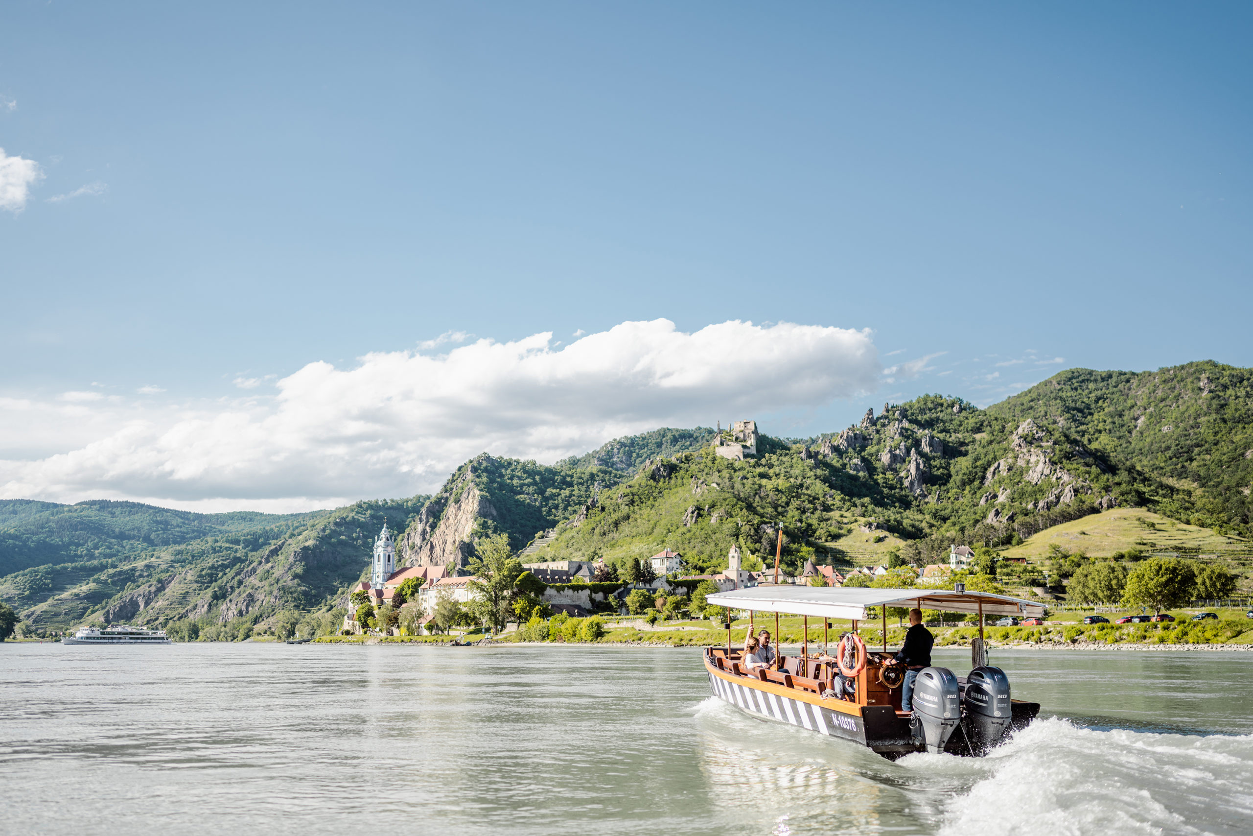 Rund um das herrschaftliche Anwesen des Hotels Schloss Dürnstein eröffnet sich den Besuchern eine Fülle an Möglichkeiten, die zauberhafte Marillenblüte in all ihrer Pracht zu erleben. Besonders beeindruckend entfaltet sich der filigrane weiß-roséfarbene Blütenschleier bei einer Wanderung über die berühmte „Marillenmeile“. Diese umfasst genau genommen ein Netzwerk aus sieben malerischen Wanderwegen, die von St. Johann im Mauerthale bis zur Gemeinde Rossatzbach führen. Auf ihrem Weg schlängeln sie sich durch beeindruckende Marillengärten und weitläufige Anbaugebiete. Für eine ebenso stimmungsvolle, aber geselligere Erfahrung können die Hausgäste des Hotels die Blütezeit bei einer Fahrt mit der hauseigenen und traditionellen Zille genießen. Das flache Holzboot gleitet sanft über die Donau, während der süßliche Duft der Marillenblüten die Luft erfüllt. Auf diese Weise wird der Frühling mit all seinen Reizen spürbar – ein Erlebnis, das alle Sinne gleichermaßen berührt.