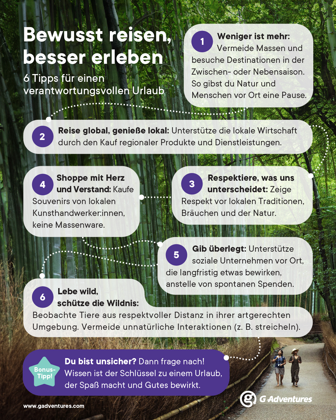 G Adventures, Pionier für Gemeindetourismus und führender Anbieter von Abenteuerreisen in kleinen Gruppen, setzt sich seit über 30 Jahren für verantwortungsbewusstes Reisen ein. Das Unternehmen bietet mehr als 750 Touren in 100 Ländern auf allen sieben Kontinenten an. Anlässlich des Internationalen Tags des Tourismus am 27. September 2024 stellt der Reiseveranstalter Tipps vor, wie Reisende verantwortungsvoll und nachhaltig unterwegs sein können, dabei die Lebensbedingungen der lokalen Bevölkerung verbessern und die Umwelt schonen (Infografik).