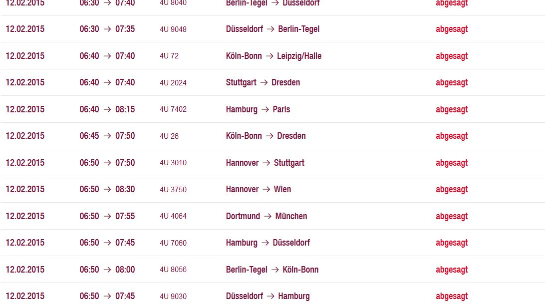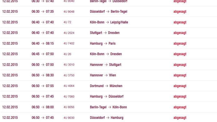Die Gewerkschaft der Piloten „Vereinigung Cockpit“ hat angekündigt, dass die Piloten der Germanwings am Donnerstag und Freitag, den 12. und 13. Februar im Zeitraum zwischen 00:00 und 24:00 Uhr ihre Arbeit niederlegen werden. Die Germanwings teilt auf ihrer Webseite mit, daß es zu erheblichen Einschränkungen bei den Germanwings-Flügen kommen wird. Jetzt sind bereits zahlreiche Flüge gecancelled. Am Abend will man einen Ersatzflugplan veröffentlichen.