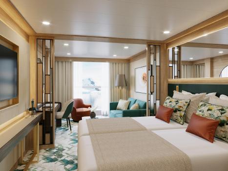 WORLD VOYAGER erhält ein helles, geschmackvolles, nordisches Design. Die zwischen 17 und 44 Quadratmeter großen Räume sind ebenfalls auf drei Passagierdecks verteilt und bieten alle ein äußerst wohnliches Flair. Neben hellen Hölzern dominieren Farbakzente in Erdtönen, die mit frischem Grün kombiniert werden. Die Kabinen und Suiten verfügen über einen eigenen Kühlschrank, Dusche / WC, eine individuell regulierbare Klimaanlage / Heizung, einen Safe sowie ein modernes Infotainment-System mit SAT-TV. Ein Highlight der elegant eingerichteten Außenkabinen sind die großen, zu öffnenden Panoramafenster oder eine eigene Veranda. Besonderer Clou: Die Fensterfronten der sogenannten „Infinity-Kabinen“ auf den Decks 5 und 6 sind mit zwei horizontalen Glaselementen ausgestattet, von denen das obere Element absenkbar ist und sich so zu einer Balkonbrüstung (Juliet-Balkon) verwandeln lässt. Die Raumaufteilung der bisherigen Junior-Suiten auf WORLD EXPLORER wird optimiert. Die neu entstehenden Kabinenkategorien sind als Infinity Deluxe Kabine bzw. als Veranda Deluxe Kabine buchbar.