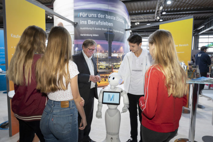 Airportchef Dr. Michael Kerkloh heute persönlich auf der Berufsorientierungsmesse „Berufsfit“. Gemeinsam mit Thimo Hobelsberger,Auszubildender am Flughafen, präsentierte er interessierten Schülerinnen Roboter Josie Pepper und gab Tipps für die beruflic he Zukunft: „Das Wichtigste ist Neugierde. Man muss sich ausprobieren, alles testen und Praktika machen, um herauszufinden was einem wirklich Spaß macht.“
