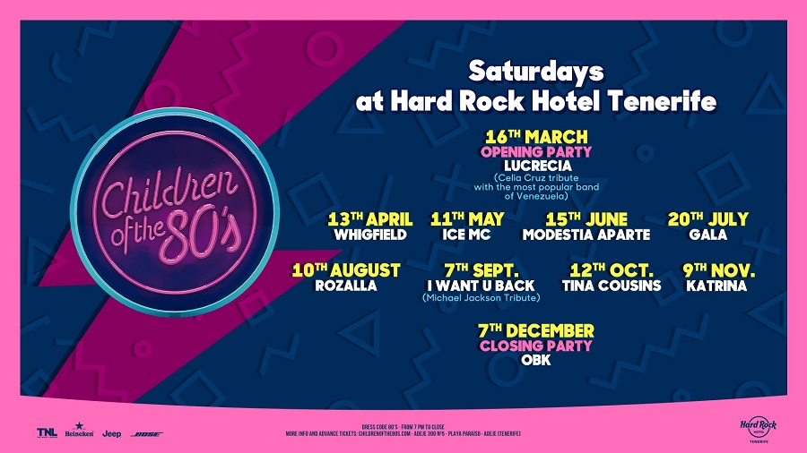 „Children of the 80″s“ wurde zum ersten Mal 2015 im Hard Rock Hotel Ibiza von The Night League organisiert und wurde schnell zu einem der erfolgreichsten Events in Ibiza für Liebhaber der Musik der 80er Jahre. Gäste des Hard Rock Hotel Tenerife haben freien Zugang zu allen Live-Veranstaltungen ohne zusätzliche Kosten.