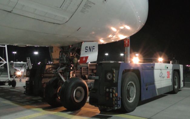 Der Fraport Schlepper holt den Airbus A-340 der SAA täglich von der Außenposition am Frankfurter Flughafen abends ab und bringt ihn zum Gate. Dafür fährt das Gespann dann einmal quer über das Rollfeld. Hierfür sind zahlreiche Genehmigungen von Ramp Control und Tower notwendig.