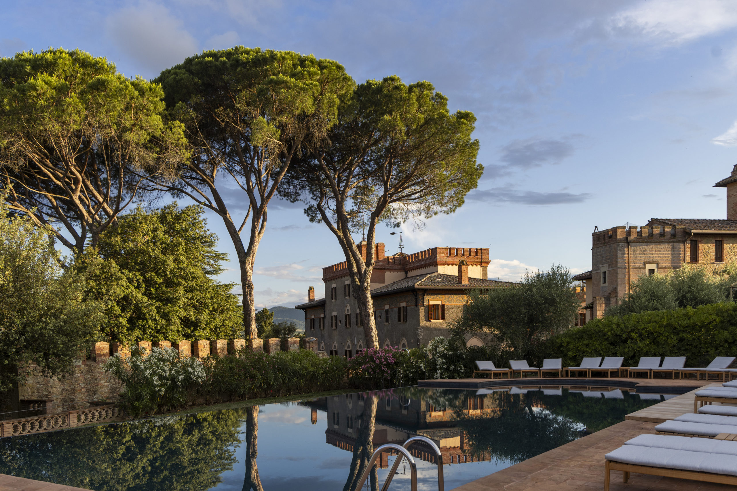 Der Spa-Bereich erstreckt sich über zwei Ebenen in einem separaten Gebäude neben der historischen Villa – ein stilles Refugium im Grünen. Vier private Behandlungsräume, darunter eine großzügige Suite für zwei, bieten Raum für Rituale, die individuell auf die Bedürfnisse jedes Gastes abgestimmt sind. Im unteren Bereich entsteht eine Thermenlandschaft der Sinne: Whirlpool, Bio-Sauna mit Blick ins Grüne, finnische Sauna und türkisches Hammam formen ein harmonisches Spiel aus Wärme, Wasser und Ruhe. Ergänzt wird das Erlebnis durch den Sensory Deprivation Room und den Salzraum – Orte gezielter Reizreduktion, die zur inneren Balance zurückführen. Eine Etage darüber liegt ein beheizter Innenpool unter sanftem Licht. Die angrenzende Terrasse öffnet den Blick über den Olivenhain – gesäumt von weichen Liegen, umgeben von Licht, Luft und der leisen Leichtigkeit italienischer Sommertage. Auf dem weitläufigen Anwesen finden Gäste außerdem einen Tennisplatz sowie einen Padel Court. Im Outdoor Gym sowie bei wohltuenden Yoga-Einheiten wird das ganzheitliche Wellbeing-Erlebnis perfekt ergänzt.