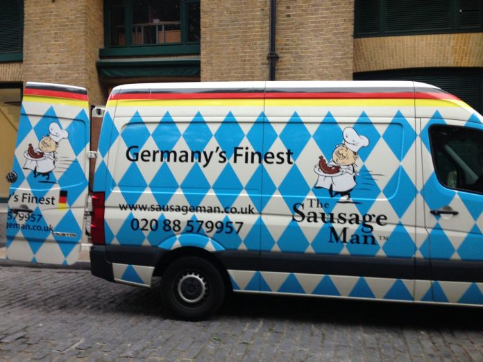 Wer die „german Bratwurst“ auch in London essen will, hat Glück. Denn es gibt in Londo sage und schreibe den Sausage-man aus Deutschland. Im blauweissen „Sausage-Mobil“ rollt der zünftige Bayer an und liefert Restaurants und Partylocations die guten deutschen Würstchen. Die Engländer mögen die deutsche Bratwurst und das hat sich für den Bayer als gute Geschäftsidee etabliert.