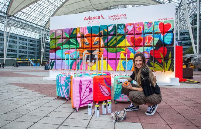 aufmerksam . Dafür hat die kolumbianische Künstlerin Viviana Grondona insgesamt 120 farbenfrohe Koffermotive angefertigt und damit zwei ausdrucksstarke Bilder kreiert. Nach der Aktion werden alle Gepäckstücke im Rahmen eines Gewinnspiels verlost, bei dem die Teilnehmer Fragen zu Lateinamerika und zu Avianca Airlines beantworten müssen.