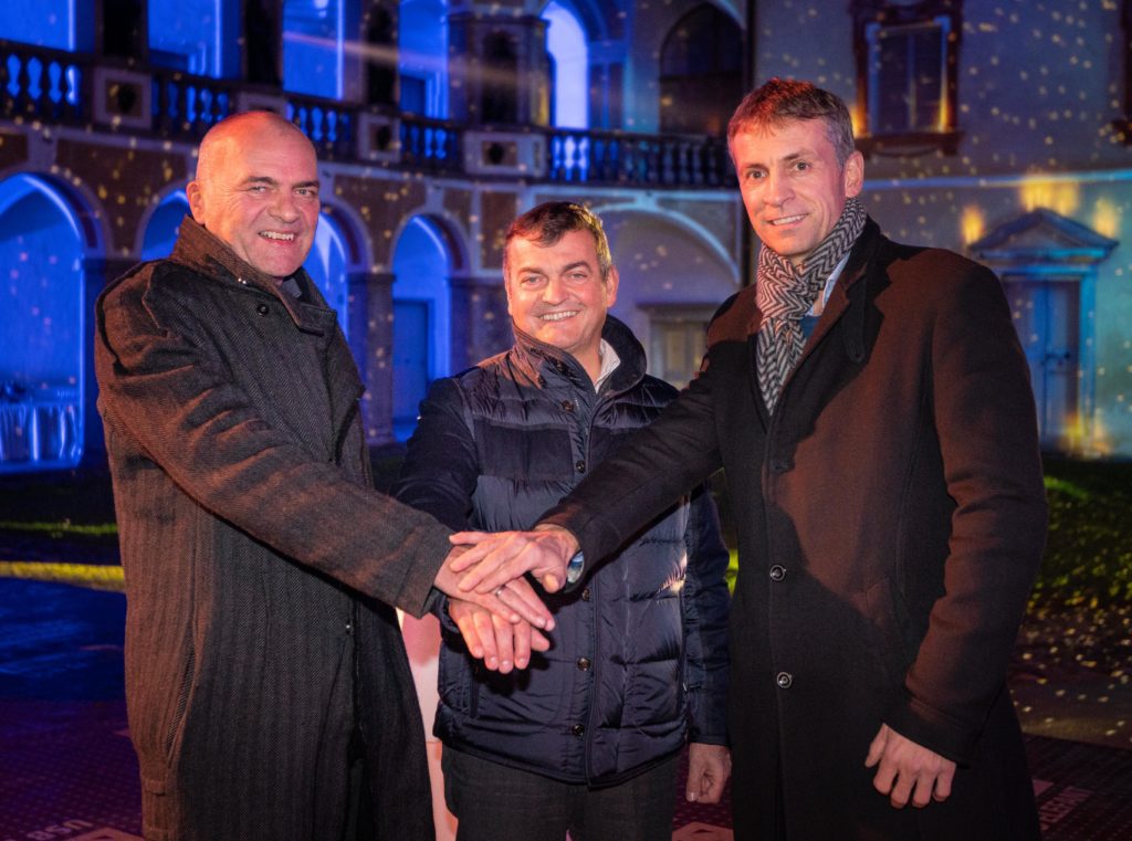 Anlässlich der Eröffnung der Licht- und Musikshow „Best of Soliman’s Dream“ in der Brixner Hofburg freuen sich Stefan Isser, Geschäftsführer der D. Swarovski Tourism Services GmbH, Karl Gostner, Obmann Innsbruck Tourismus und Markus Huber, Obmann Brixen Tourismus Genossenschaft über eine erstmalige länderübergreifende Kooperation. Die Swarovski Kristallwelten, die Kaiserliche Hofburg Innsbruck und die Hofburg Brixen erleuchten mit den drei größten Lichtshows der Vorweihnachtszeit Tirol und Südtirol.