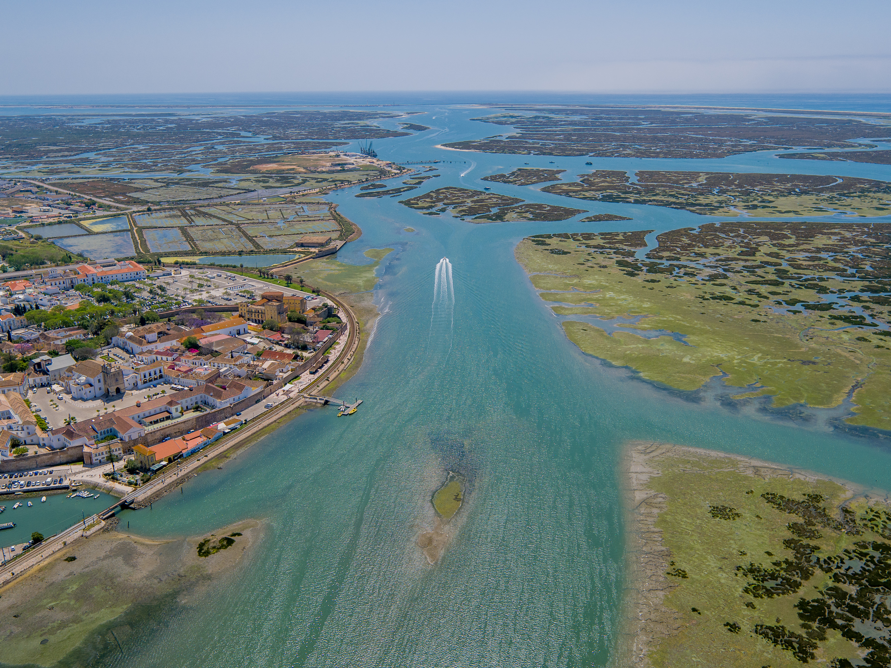 Am 28. September ist das unbemannte Fluggerät dann ganz im Osten der Algarve unterwegs und zeigt bei Olhão die herrliche Landschaft des Naturschutzgebietes Ria Formosa mit seinen vorgelagerten Inseln und die flachen Salzpfannen, in denen sich das Licht der Spätnachmittagssonne spiegelt, sowie den Ort selbst, der sich mit seinen meist kubischen Häusern vom Rest der Algarve deutlich unterscheidet.