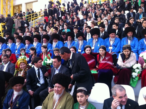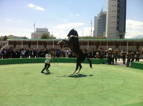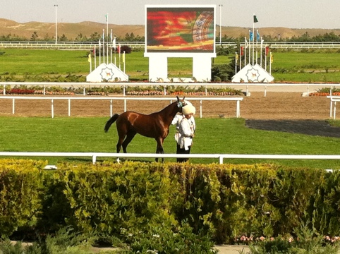 Bereits am zweiten Tag hatte Turkmenistans Präsident Gurbanguly Berdymuchammedow zur großen Zuchtschau auf der Pferderennbahn geladen. Tausende Besucher folgten dem Ruf und erlebten auch hier eine sagenhafte Inszenierung. Der Präsident selbst ließ sich zu Beginn sein Pferd satteln und drehte die ersten Runden auf der grosszuegigen Rennbahn. Unter dem Jubel des Publikums führte der pferdebegeisterte Präsident eine Showeinlage der Extraklasse vor.