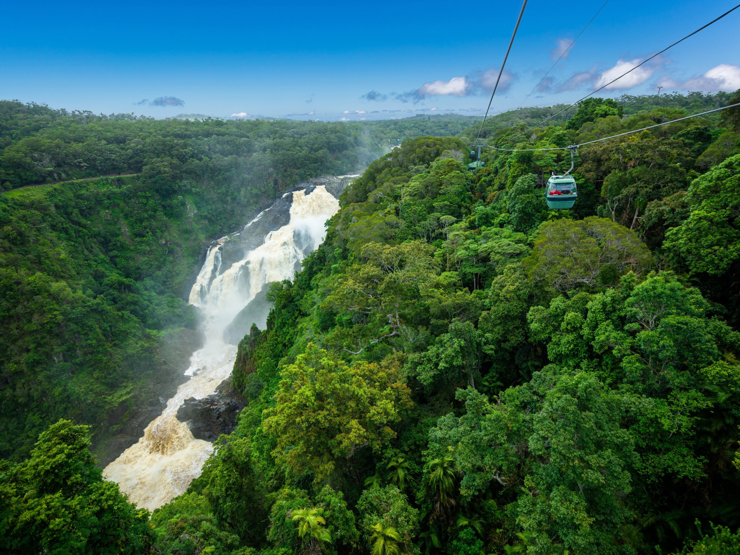 Aus der Gondel erleben Besucher den Dschungel hautnah: Sie gleiten auf einer Länge von 7,5 Kilometern über den Wipfeln des Regenwaldes der Wet Tropics und genießen dabei atemberaubende Ausblicke. So liegt einem der tropische Urwald im wahrsten Sinne zu Füßen. Der Streckenverlauf umfasst drei Abschnitte: Beim ersten Halt an der „Red Peak Station“ sollte man sich den 20-minütigen, von einem Ranger geführten Regenwald-Spaziergang nicht entgehen lassen. Dabei können riesige Würgefeigen und andere Baumriesen bestaunt werden. An der zweiten Mittelstation „Barron Falls“ kann man den gleichnamigen Wasserfall bewundern: Hier sorgt der Lookout „The Edge“ für Nervenkitzel, denn ein Teil des Boardwalks ist mit Glasboden versehen und ermöglicht es, 160 Meter über dem Abgrund der Barron Gorge zu stehen.
