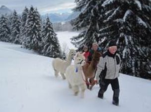 Mit ihrer typischen ruhigen, aber dennoch neugierigen Art, gewinnen die flauschigen Alpakas schnell das Herz aller Schneeschuhtour-Geher. Jeder von ihnen darf während der Tour ein Tier selbst führen. Auch für Kinder ab ca. 12 Jahren ist die leichte Wanderung durch den Schnee geeignet.