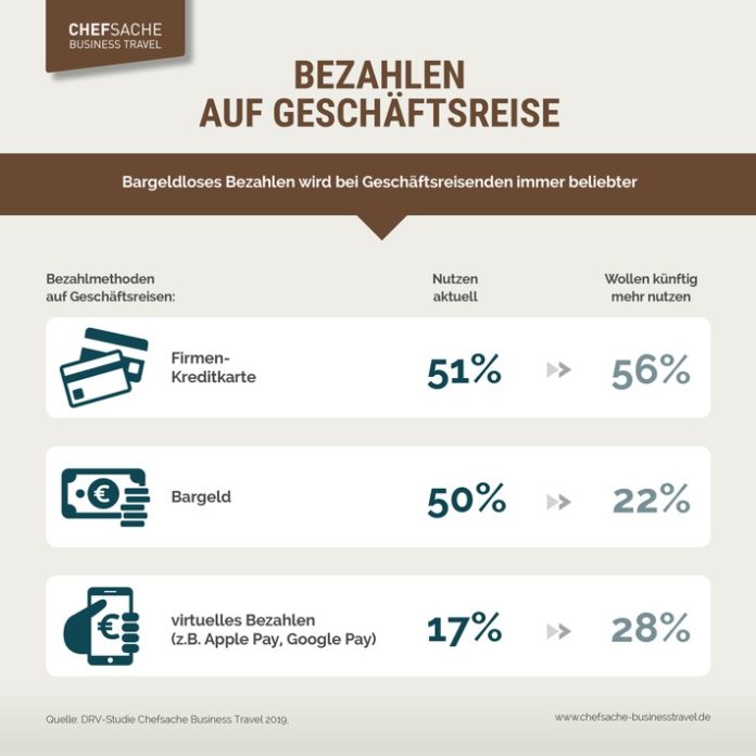 Jeder zweite Geschäftsreisende zahlt Rechnungen unterwegs weiterhin bar. Digitale Optionen sind dagegen noch eher Zukunftsmusik. Ein Grund: Vier von zehn Dienstreisenden haben derzeit noch wenig oder gar kein Vertrauen in die virtuellen Bezahlmöglichkeiten per Smartphone. Das sind die Ergebnisse der aktuellen Studie „Chefsache Business Travel 2019“, einer Initiative von Travel Management Companies im Deutschen Reiseverband (DRV).