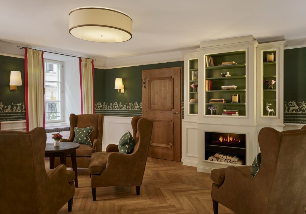 Angrenzend an den Rosa Salon, in dem nicht nur das Frühstück für Hotelgäste serviert wird, sondern auch Veranstaltungen stattfinden, ist ein Kaminzimmer entstanden, das als gemütlicher Rückzugsort dient. Meetings und Feierlichkeiten für bis zu 16 Personen finden ab sofort auch im neuen „Weinkabinett“, einem eleganten Bankettraum im Erdgeschoss des Hauses, statt. Wie der Name schon vermuten lässt, hat hier die Weinsammlung des Hotels ihren Platz gefunden und veredelt die Wände gemeinsam mit historischem Holz.