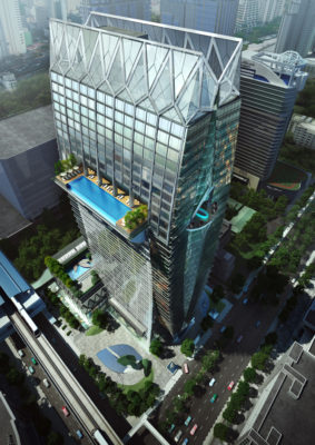 Das Hotel nimmt die drei unteren und die zwölf obersten Etagen des Neubaus ein, der strikt nach Umweltkriterien errichtet wurde – ein Konzept, das der Okura-Überzeugung, Ökologie und Luxus müssen kein Gegensatz sein, auch architektonisch entspricht. Dass die äußere Form des „grünen“ Hochhauses überdies inspiriert ist vom „Wai“, der traditionellen thailändischen Willkommengeste mit zwei vor dem Oberkörper aneinander gelegten Handflächen, passt ebenfalls gut zum Konzept der Gastlichkeit, die Okura als japanisches Unternehmen in besonderem Maße pflegt.