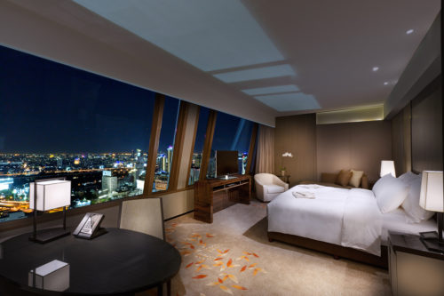 Die 240 großzügig geschnittenen Zimmer (47 bis 65 qm) und Suiten (80 bis 302 qm) bieten weite Blicke über Thailands Hauptstadt, ausgestattet sind sie selbstverständlich mit moderner Kommunikationstechnik. Das Business Center ist nicht nur mit allem ausgestattet, was ein Geschäftsreisender benötigt, es bietet oder vermittelt auch alle erforderlichen Dienstleistungen. Das Spa des Hauses ergänzt das erwähnte zehn Meter aus dem Gebäude hervor ragende Schwimmbad, im Fitness Center finden sportliche und gesundheitsbewusste Gäste Geräte auf neustem Stand.