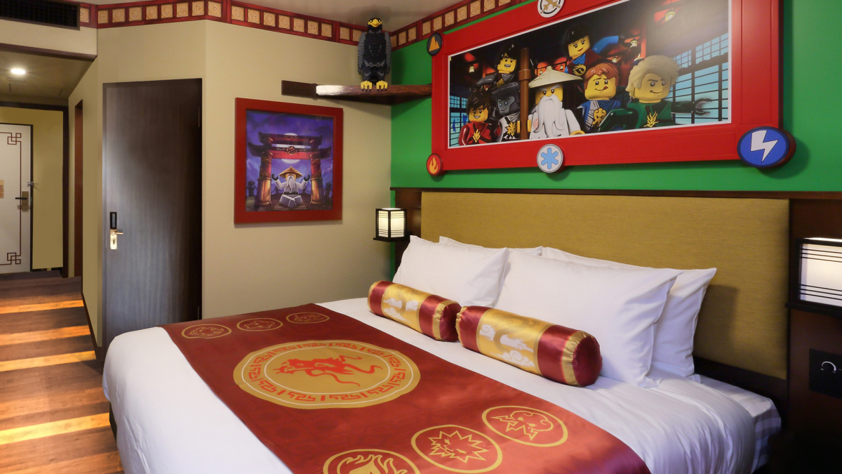 Nach einem aufregenden Familientag im LEGOLAND Freizeitpark schlafen kleine Ninja-Anwärter abends glücklich und zufrieden im separaten Kinderzimmer ein. Dieses gleicht einer sagenhaften Diamantenhöhle, in der die NINJAGO Lieblinge Lloyd und Kai die funkelnden Schätze und natürlich die süßen Träume der jungen Gäste bewachen. Bevor die Familie am nächsten Tag nach einem reichhaltigen Frühstückbüffet ins Freizeitpark-Abenteuer startet, können die Kids mit der im Kinderzimmer integrierten LEGO Bauplatte und den passenden bunten Steinen kreativ werden – der Traum aller Eltern, denen dadurch morgens womöglich ein paar Minuten mehr Schlaf geschenkt wird.