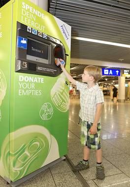 Ein letzter Schluck vor der Sicherheitskontrolle, aber dann wohin mit der Wasserflasche? „Spende dein Leergut – Donate your empties“ lautet das Motto auf den 24 Rückgabeautomaten für Pfandflaschen, die seit 2013 in den Terminals am Flughafen Frankfurt stehen und Passagiere dazu auffordern, den Wert des Leergutes einer gemeinnützigen Organisation zu spenden.