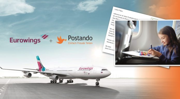 Die Tische hochgeklappt, die Sitze in eine aufrechte Position gebracht – bereit machen zum Start in die Heimat! Während des Rückfluges lässt sich der erlebnisreiche Urlaub noch einmal ausgiebig Revue passieren. Plötzlich der Schock: Man hat die versprochenen Postkarten an Freunde und Verwandte vergessen! Eurowings-Passagiere können in dieser Situation aufatmen. Denn dank der neuen Kooperation mit der Postkarten-App Postando versenden sie ihre individuell gestalteten Urlaubsgrüße ab sofort direkt aus dem Flugzeug vom Smartphone als echte Postkarte an ihre Liebsten.