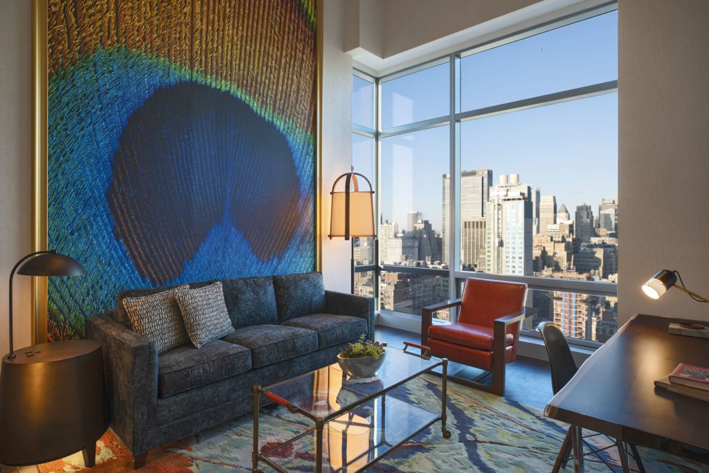 In den 341 Gästezimmern und Suiten dominieren Erdtöne. Zu den Features zählen beispielsweise Tapeten mit Holzpaneel-Aufdruck oder unerwartete verspielte Elemente wie Mini-Schreibtischleuchten und kaninchenförmige Wandhaken. Die Bäder erinnern an eine originelle Gartenlaube mit Beton-Waschbecken, Porzellanfliesen und mit Wildblumenmuster verzierte Spiegel. Die Suiten auf der 4. und 36. Etage verfügen nicht nur über mehr als vier Meter hohen Decken, sondern auch über eine deckenhohe, wandgroße gerahmte Installation einer Pfauenfeder sowie ein großes Bild mit einer Frauensilhoutte aus fuchsienfarbigen Rosen von der Künstlerin Sara Byrne.