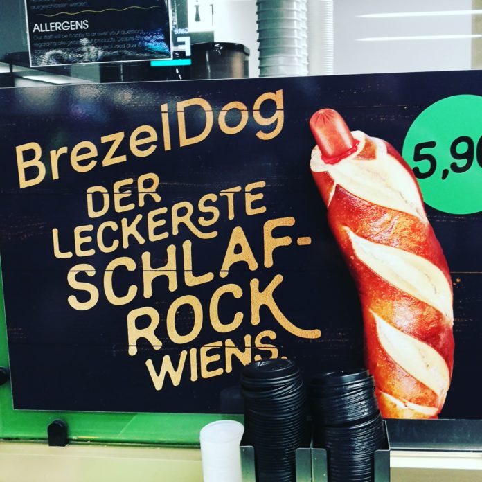 Ein besonderes Fundstück: Am Wiener Flughafen haben wir den BrezelDog gefunden. Ein Art Hotdog oder wie der Wiener zu sagen pflegt: Ein Würstchen im speziellen Schlafrock.