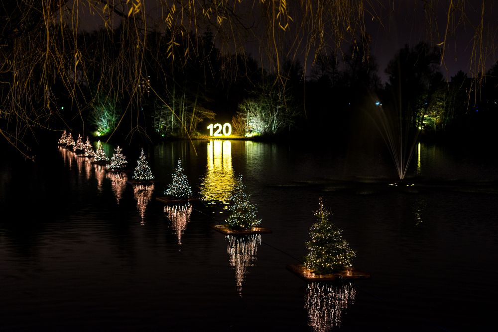 Lichterglanz all überall: Mehr als 144.000 kleine Lämpchen verwandeln das Kempinski Hotel Frankfurt in eine weihnachtliche Glitzerwelt. Ungewöhnlicher Hingucker sind vor allem elf Weihnachtsbäume, die auf Holzflößen auf dem See des hoteleigenen Parks schwimmen. In der Dunkelheit zaubern sie mit ihren Spiegelbildern auf der glatten Wasseroberfläche eine ganz besondere Stimmung. Im ganzen Park verteilte Lichter setzen die romantische Stimmung fort.