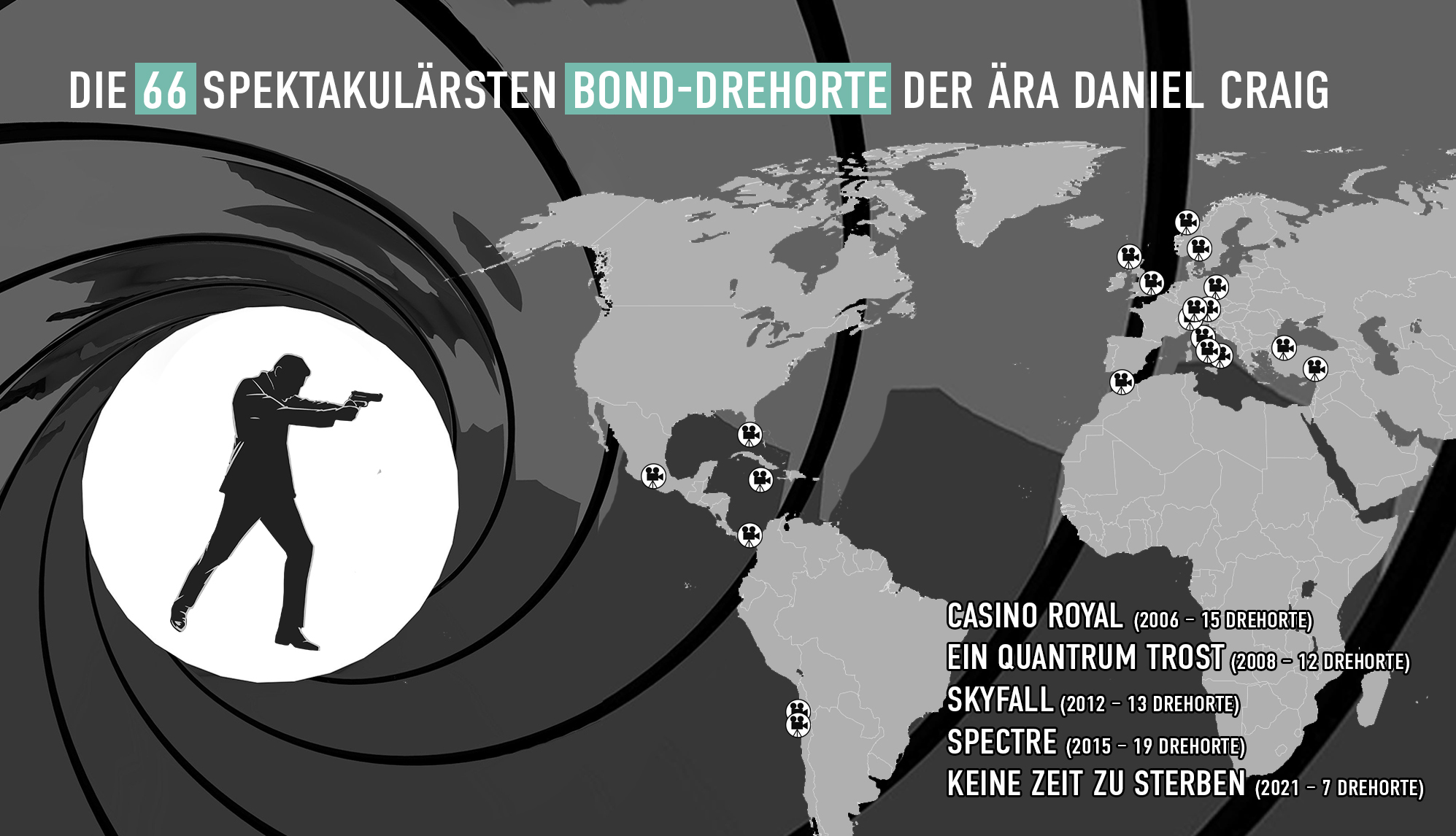 ● In 15 Jahren als 007 hat Daniel Craig in insgesamt 15 Ländern und auf 5 Kontinenten Bösewichte gejagt