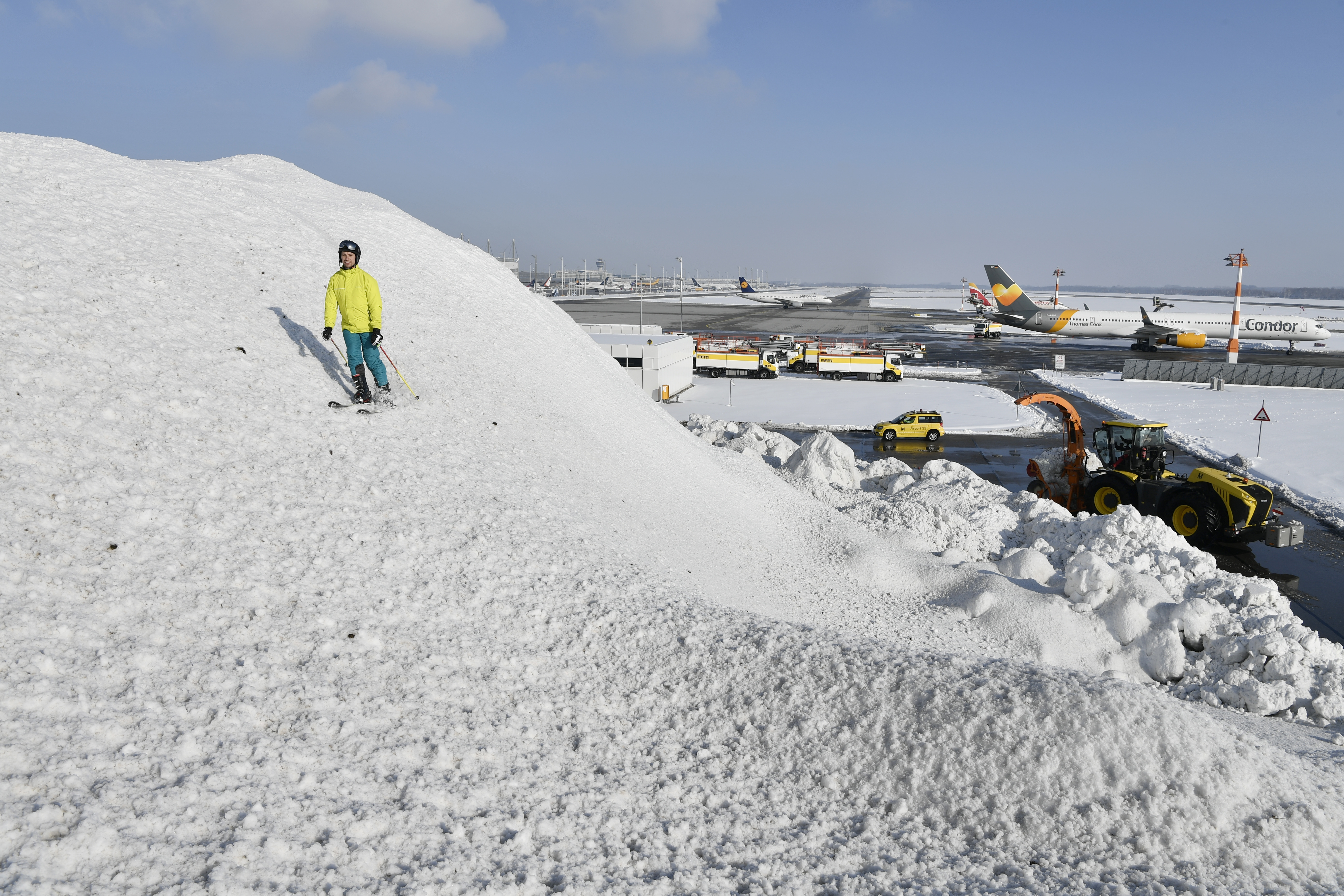 Beste Wintersportverhältnisse herrschen derzeit am Münchner Flughafen. Davon konnte sich auch Christian Langer überzeugen. Der Mitarbeiter der Verkehrsleitung am Flughafen München hat normalerweise den Zustand der Pisten, auf denen die Flugzeuge starten und landen, im Blick. Für das ungewöhnliche Fotomotiv ließ er sich ausnahmsweise zu einer Pistenkontrolle auf den Schneeberg schicken. Der eindrucksvolle weiße Hügel ist das Resultat der Einsätze des Winterdienstes, der die Rollwege am Airport rund um die Uhr von